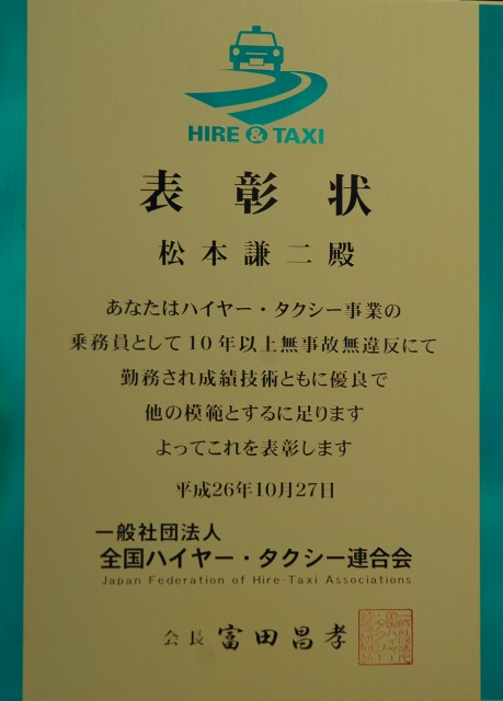 10年無事故無違反全国表彰受賞 乗務員 松本謙二 勤続34年