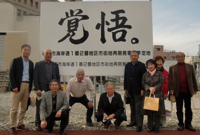 塩釜市海岸通再開発に一身を投げ打つ後輩の「覚悟の書」の前で