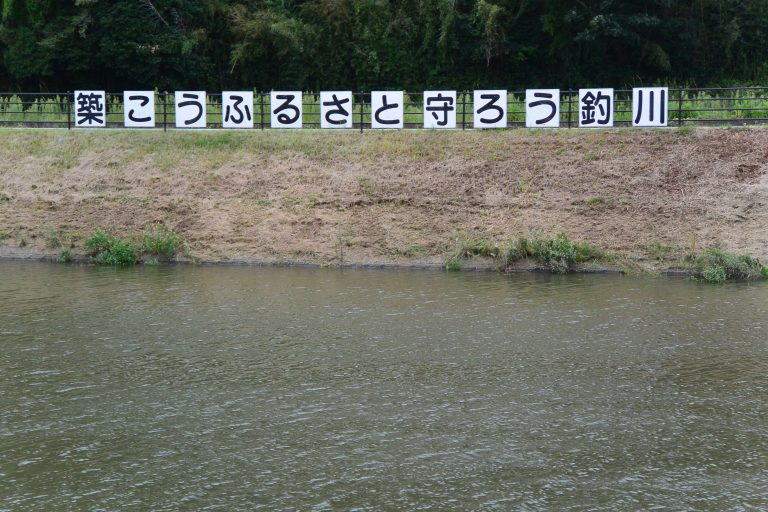 1982年「釣川ボランティア運動」のスローガン 今も当時のまま釣川の護岸に立っている(2016.8.31撮影)