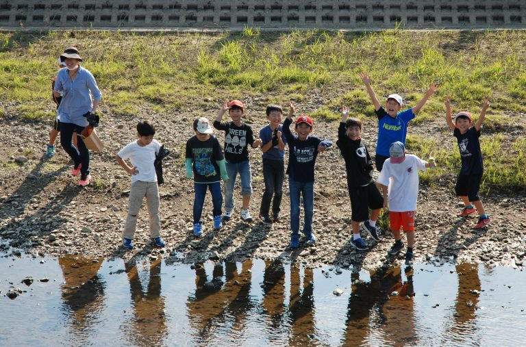 宗像の命の水「釣川」に親しみ、清掃活動をする地元の小学生 と先生(2017.10.27)